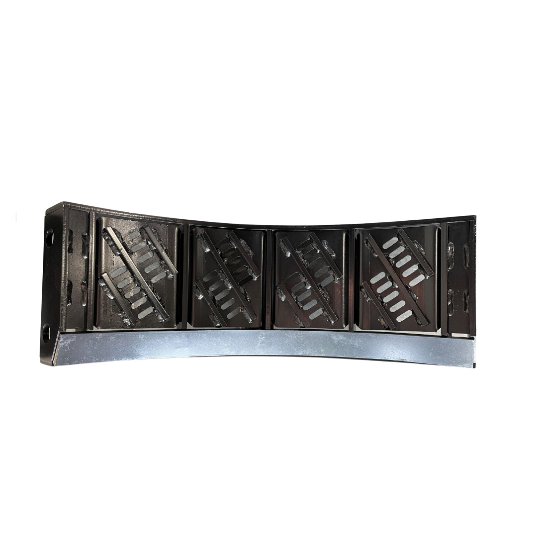 Concave consists of main frame and 4 boron max thresh inserts. The Boron Max thresh insert has narrower slots than the regular max thresh insert. It is typically positioned at the front of the concave, as it is designed for maximum threshing. It has small holes to allow early separation of already threshed grain, is 180-degree reversible, and is boronized for extended wearability. Boronizing is a thermo-chemical hardening process used to improve the life and performance of metal components and strengthen resistance to corrosion and abrasive wear. Left hand configuration.