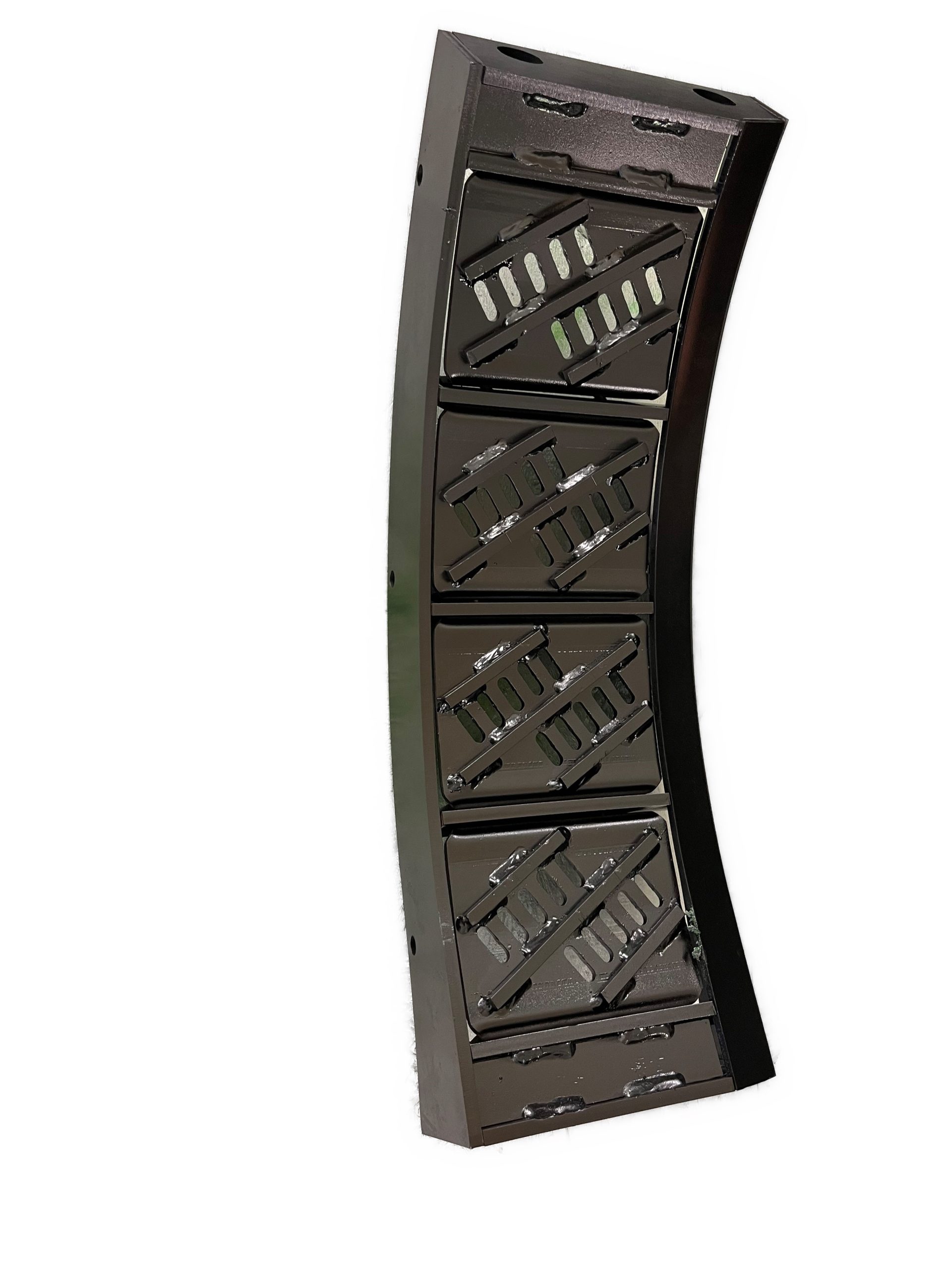 Concave consists of main frame and 4 regular max thresh inserts. Regular Max thresh insert is normally used in the front area of the concave. The angled helical bar provides for head-on threshing and has slightly larger holes than the Boronized Max Thresh Insert to encourage early separation. These inserts are individually replaceable and 180 degree reversible to extend the life of the insert. Right hand configuration.