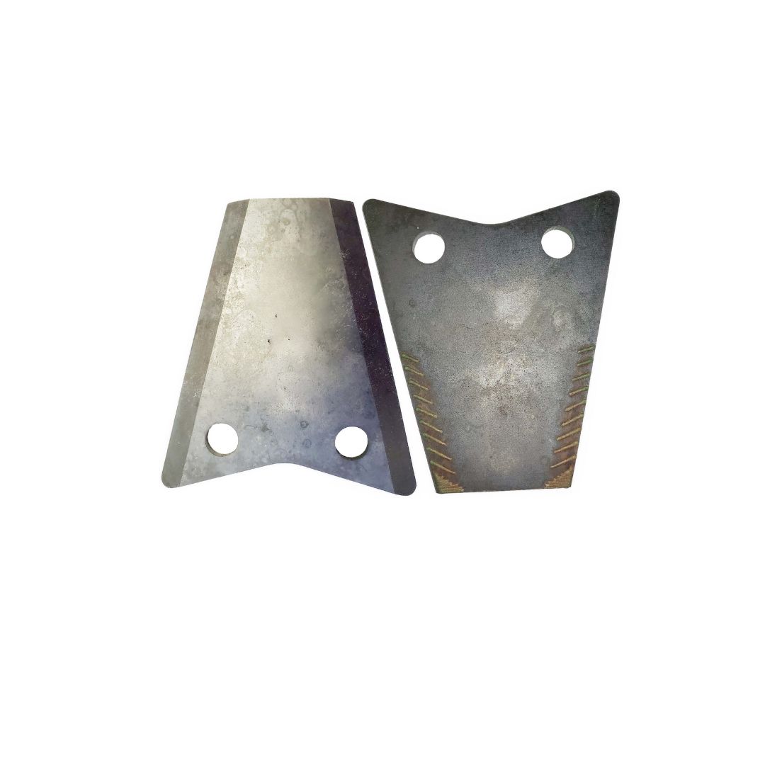 Stay sharp design, with tungsten carbide lasering – lasered strips wear at a slower rate than the blade steel causing a natural serration and the blade to sharpen as it wears. Improved residue management (optimized size and distribution). Longer maintained rotor balance due to the additional tungsten carbide deposition in the corners of the blade.